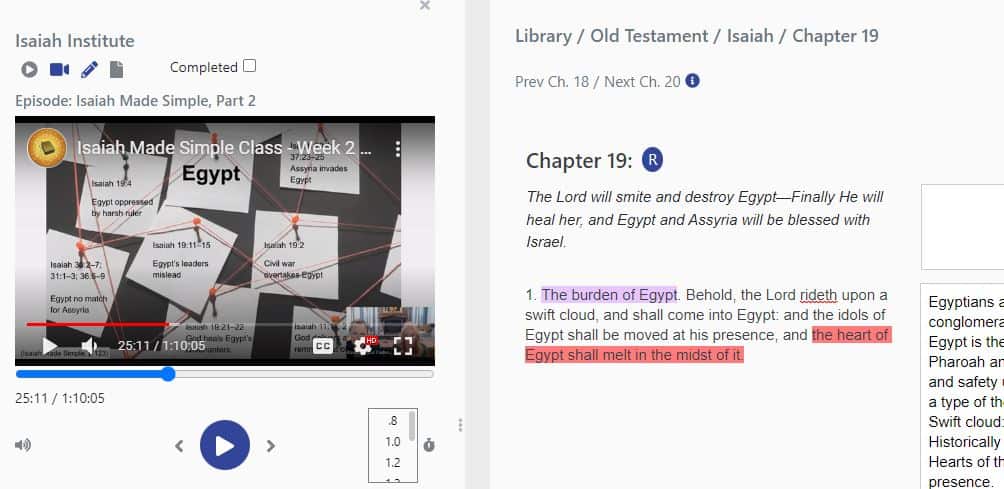 To access the videos simply go to any chapter in Isaiah and click the “R” button by the chapter number to open the resources. Each chapter contains the Analytical Commentary as the first link, and then the Isaiah Made Simple presentations.