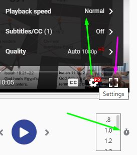 If the video is playing too slow (or fast) for you, you can click (green arrows) the gear button to access playback speed, or click the stopwatch icon to pull up speed controls (useful for when a video or audio file isn’t on YouTube and you need to adjust the speed.