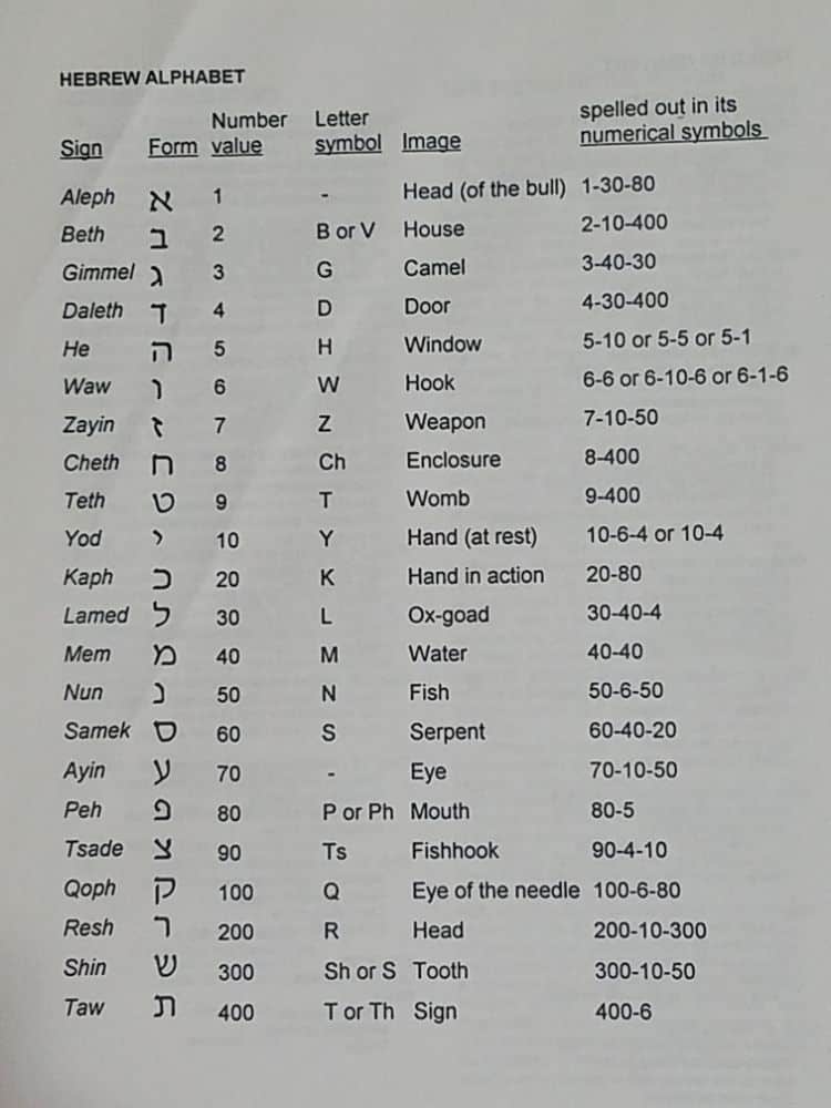 To begin, the Hebrew language consists of 22 consonants which all have meaning. The structure of a word that has different vowels but the same consonants as another word, changes the image, but not the core structure of the word. It is this structure that tells all. This page shows the name of the sign, the letter/form, the numeric Gematria value of the letter, the English symbol, the ancient Hebrew image of that letter, and then how that letter’s name is spelled (ex. Aleph is A-L-Ph or 1-30-80).