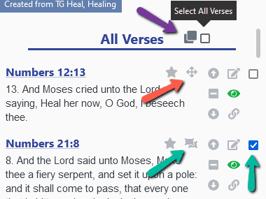 From any topic, turn it into a collection note. (Soon you won’t have to take this step). Now at the top of every pane you will see this overlapping card icon (purple arrow) and when you click it, a checkbox will appear next to it and every verse below it. This is available in a reading pane, search pane, or collection note.