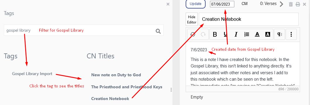 He is the import of this creation notebook. The date of the note will be put into the creation date field for the collection note. The date will be included in the master note text if you check the box to include dates. It will be given a tag of “Gospel Library Import” so if you have lots of these, you can quickly find them in your tag tree and work on them individually later. By removing the Gospel Library Import tag in the collection note, and putting real tags in, you will build out your own tag tree and this list will get smaller until it disappears.