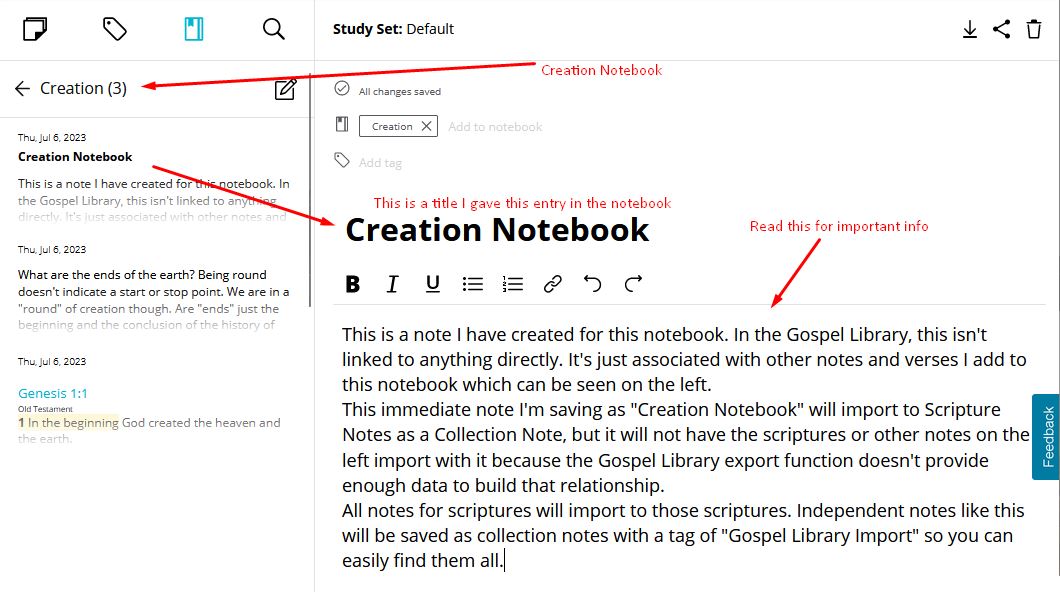 - All individual notes not tied to a verse are imported as a Collection Note with a tag of “Gospel Library Import”