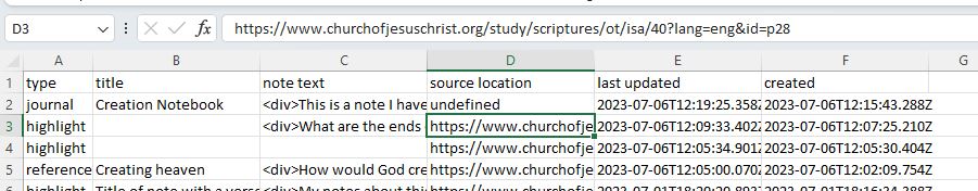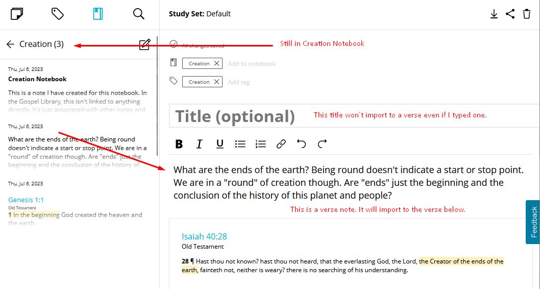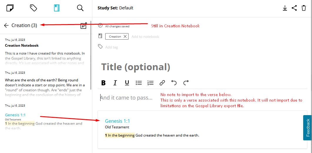 This shows a verse note with a title of “Creating heaven” and a linked verse to Moses 2:1. The note and title will import to Scripture Notes but not the linked to verse in Moses 2:1.