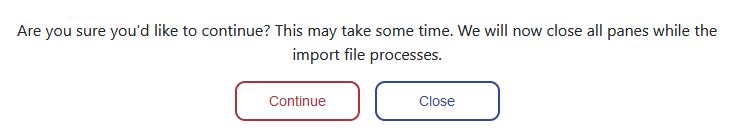 Popup 1 – clicking continue will close all panes except your account settings. If for some reason your panes don’t close, don’t panic. When the import process is done, please close your panes and reopen them. It may be best to sign out and back in to ensure a clean start.