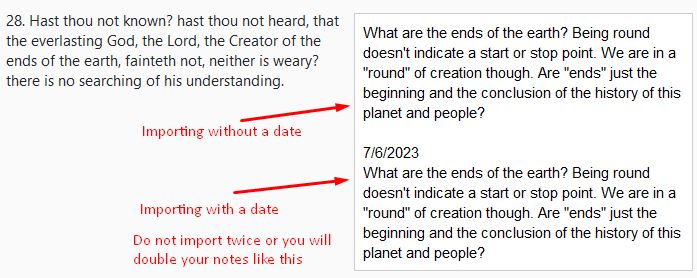 Regardless, if you don’t include dates, the notes (if you have more than 1 for a verse) will still import in a sorted manner to verse notes with most recent at the top under the assumption that more recent notes are most relevant or important to your understanding.