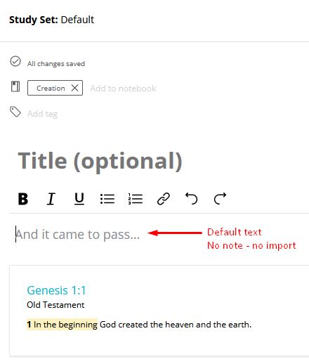 Verses included in a notebook that have no note will not be imported at all like this one for Genesis 1:1 which only has highlighting.