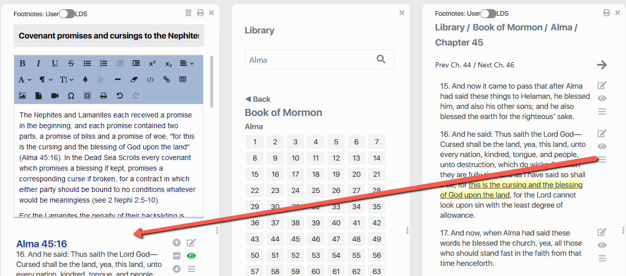 I put my collection note pane on the left, open a library pane, start to type a book name in the search panel to quickly view that book, then click the chapter I want to get to and open it up. I then find the verse referenced in the quote and drag it into my collection note.
