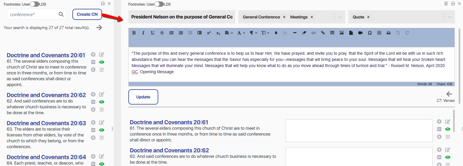 Now you want to give yourself plenty of ways to retrieve this note. You are already associating the statement with all the verses that talk about conferences, so any time you see one of those verses, you’ll also be able to find this quote. Now you want to now make the title and tags things that will help you remember it.