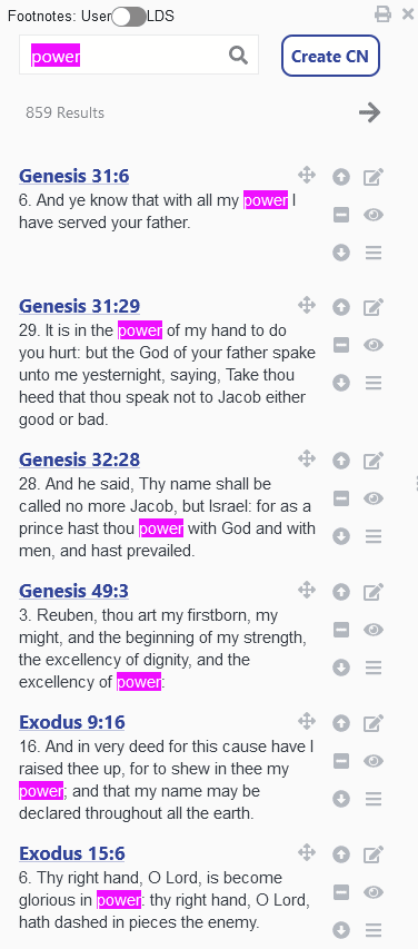 3) Pairing. Going back to the original search results, I want to know what other meaningful words are in the verses along with the word power. As I scan the list of verses, I jot down some words I see that I want to do searches on. like holy or holiness, glory, light, truth, miracle, endow, and spirit, and then perform those searches which produce sets of verses to study in that context.