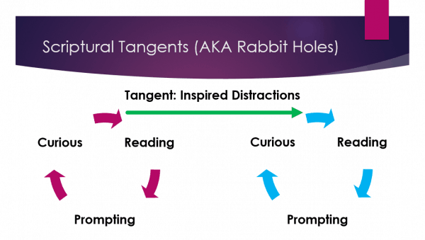 As with any study project, there are words that jump out at you. Sometimes I like to refer to these spiritual tangents as scriptural rabbit holes because they can go deep and in unexpected directions. Here’s a visual for how I tend to study. I’m reading something and suddenly I get a prompting to pay attention to something. If I allow my curiosity to be piqued, I may follow that tangent to another reading and dig in. This method of searching has led to some interesting discoveries over the years. Sometimes I get curious about something but there’s nothing there to follow and I go right back to what I was doing. Often there is more than meets the eye. The thing to be aware of is when we read, don’t say, “I have to finish the chapter” and then ignore all the inspiration that comes to you along the way.