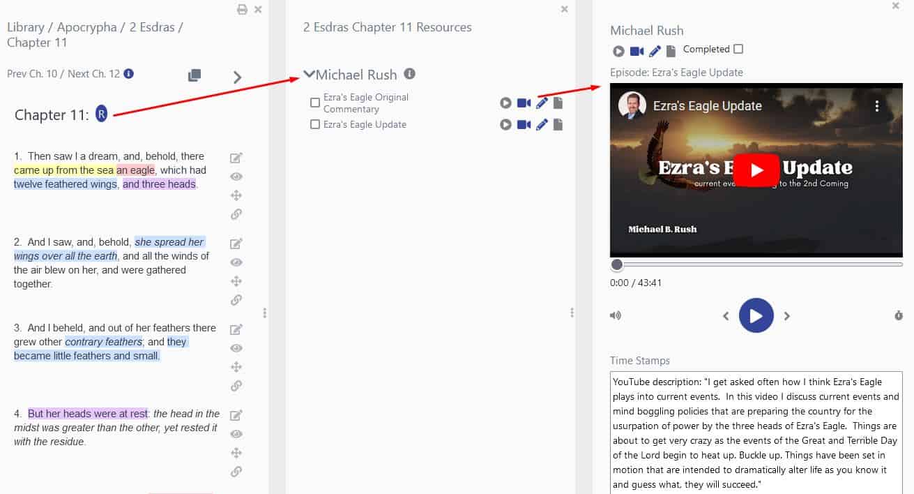 One thing you may enjoy doing first, particularly if you are a fan of the research Michael Rush has done on the Ezra’s Eagle prophesy in 2 Esdras 11 and 12 (amazing stuff which I believe is a true prophesy of the United States in these last days), is go to chapter 11 and open the chapter resources and listen to Michael’s commentary while you follow along and take notes.