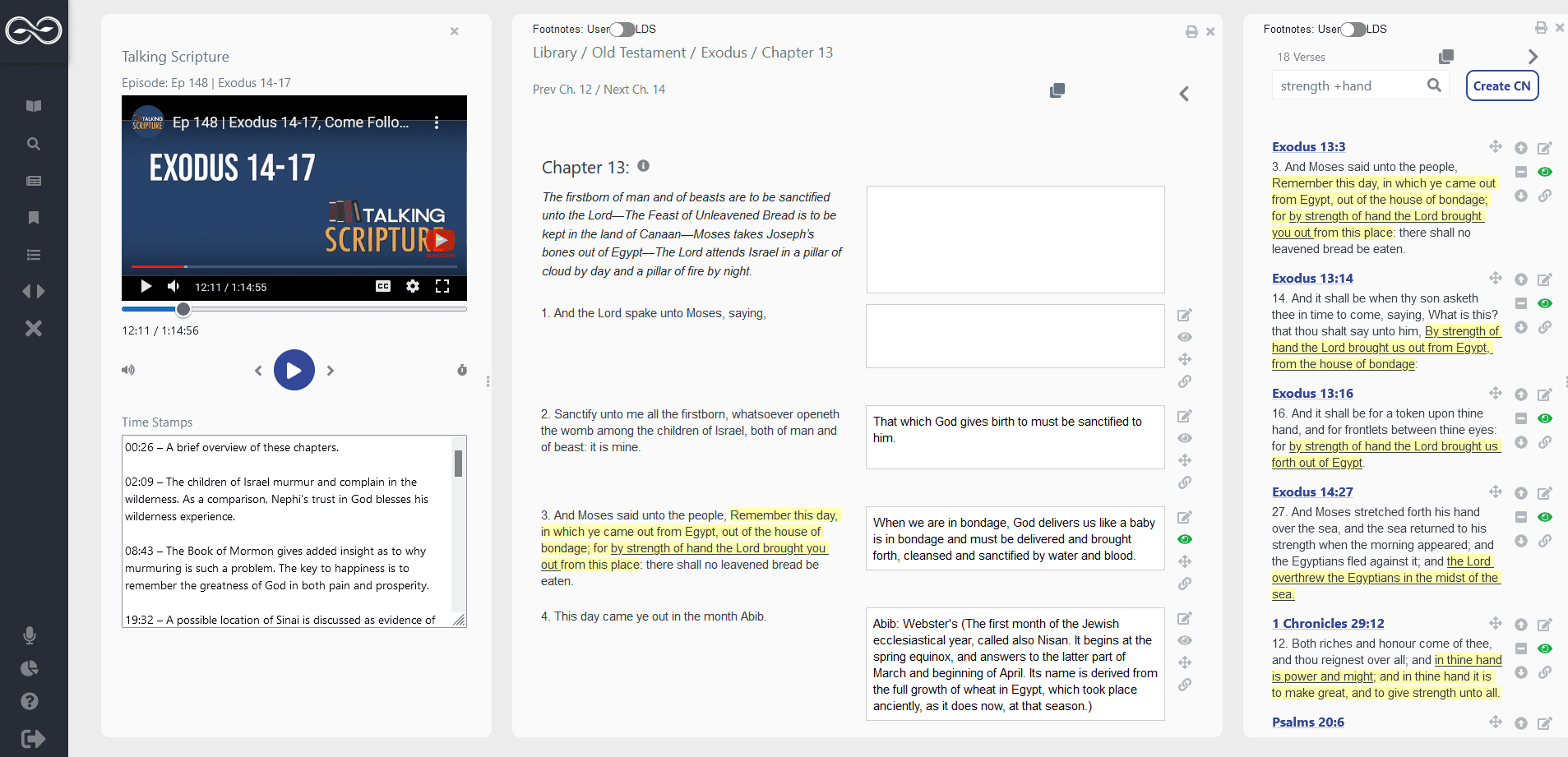 Scripture Notes lets you drag and drop panes around so to get started, I like to put the podcast on the left and scriptures on the right so when I open other chapters or search panes, they appear on the right.