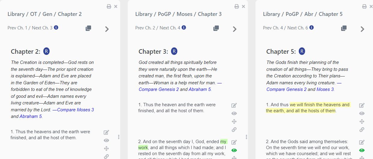 Now things start to get tricky. A careful reading of the creation story cannot be done by reading straight through the various chapters of Genesis, Moses, and Abraham. It requires a side-by-side reading which you can do with Scripture Notes in multiple columns comparing the text and making notes, but I found for this particular project, it was also helpful to open an Excel spreadsheet to make simple notes about unique things I was finding.